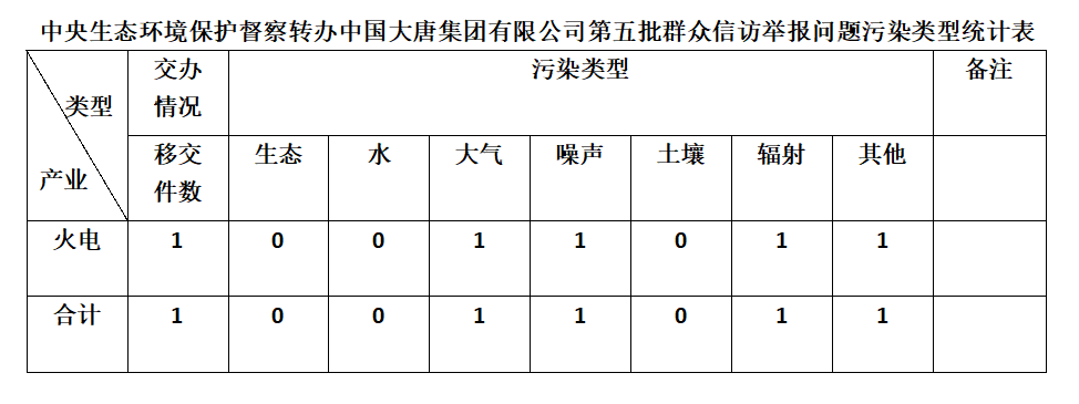 2025年6月7日,中央第七生態(tài)環(huán)境保護督察組向中國大唐集團有限公司移交第五批群眾信訪舉報件,共計1件,為來電舉報,涉及大氣問題1個、噪聲問題1個、輻射問題1個、其他問題1個。所有舉報件辦理工作已第一時間進入調(diào)查核實辦理程序,辦理情況將按照相關(guān)要求反饋督察組,并及時向社會公開。